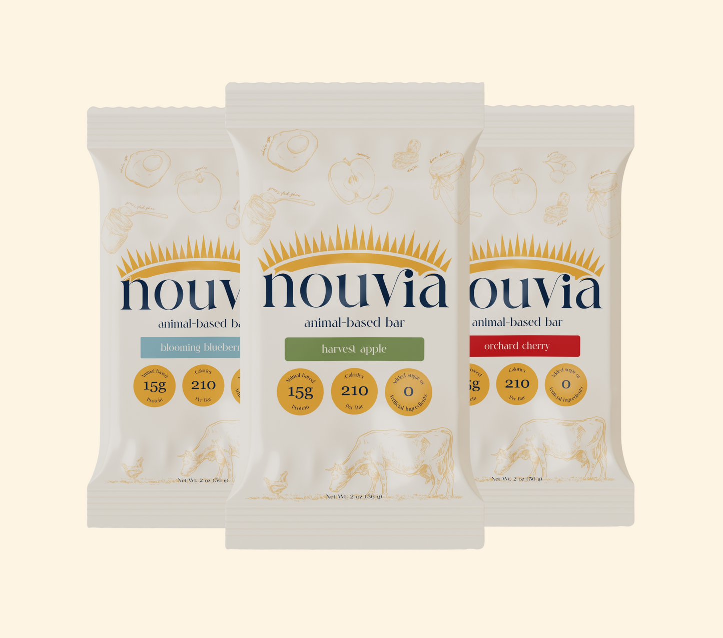 One whole pasture-raised egg, grass-fed beef bone broth, and sweetened with fruit. No artificial sweeteners. That is what you get in every Nouvia Bar.